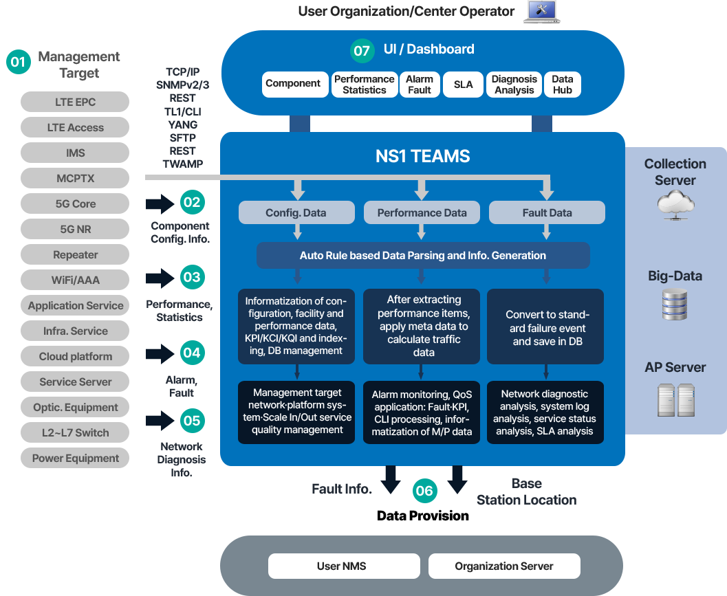 After automating management targets through configuration management, automatic collection of performance, statistics, and alarms and threshold-based fault processing - Apply statistical formula → Create metadata → Hourly/daily/monthly statistics - Apply QoS Alarm → Issue Trouble Ticket → Vigilance - Application service server resources, HW Fault, Process monitoring
